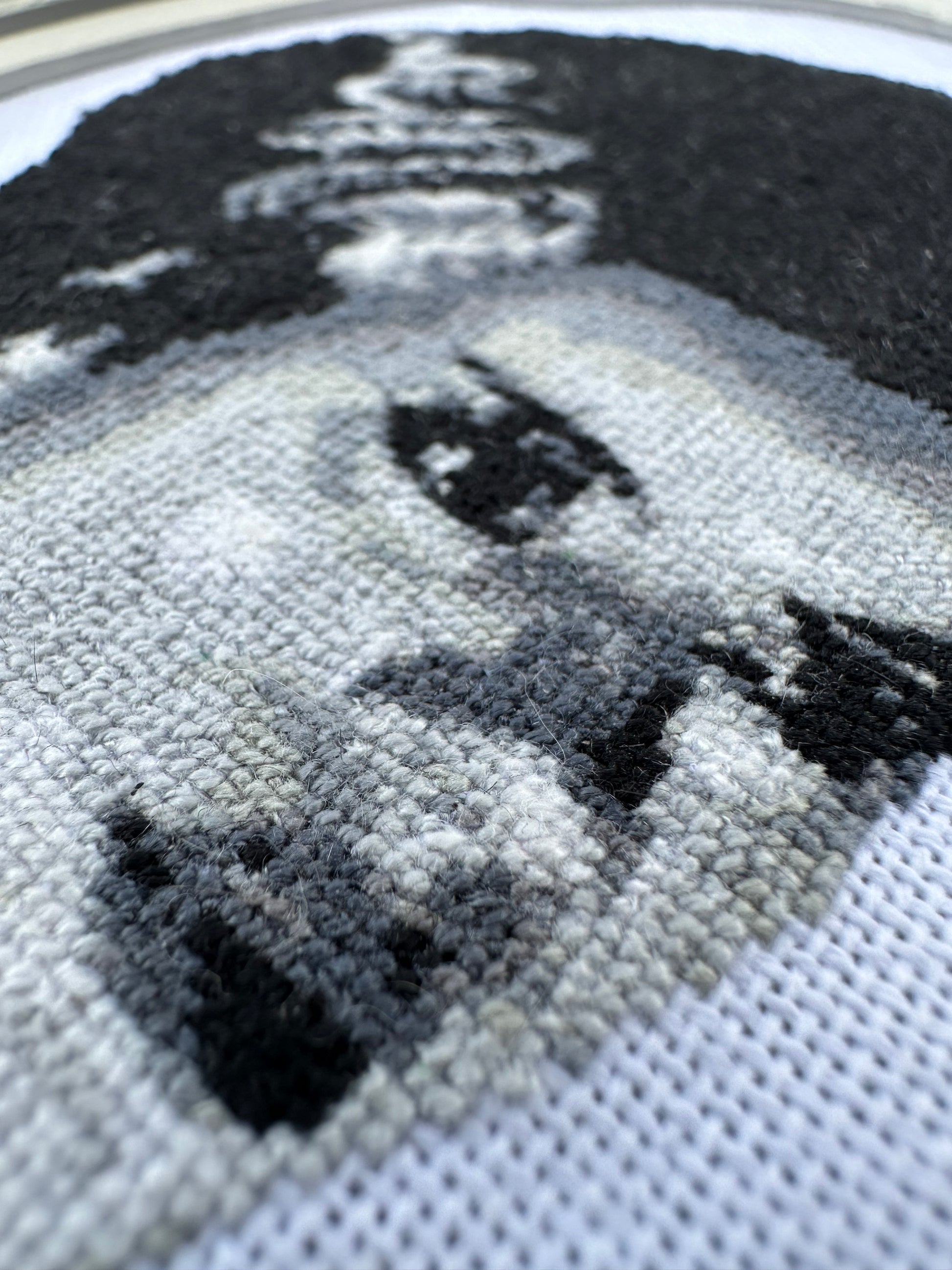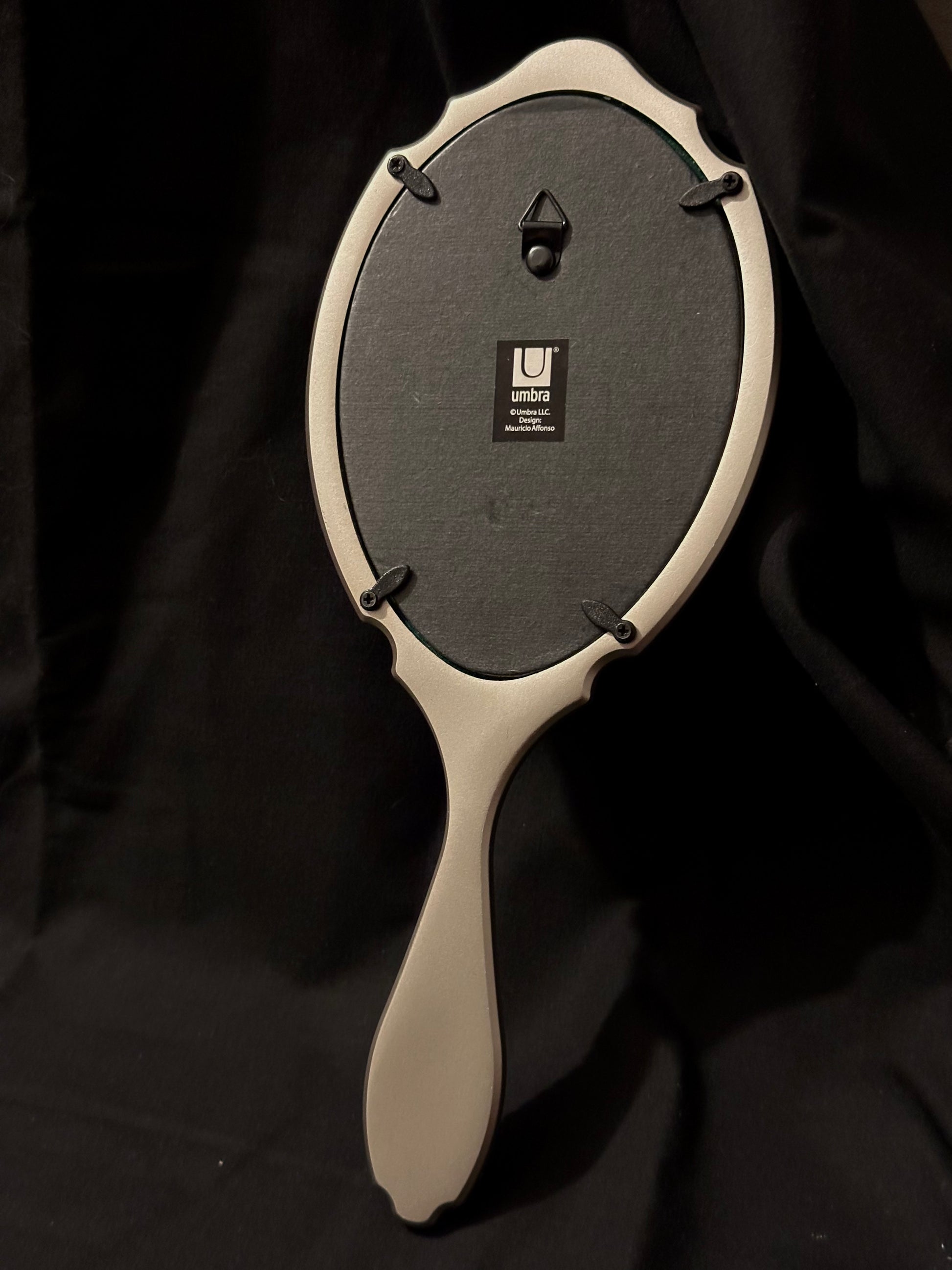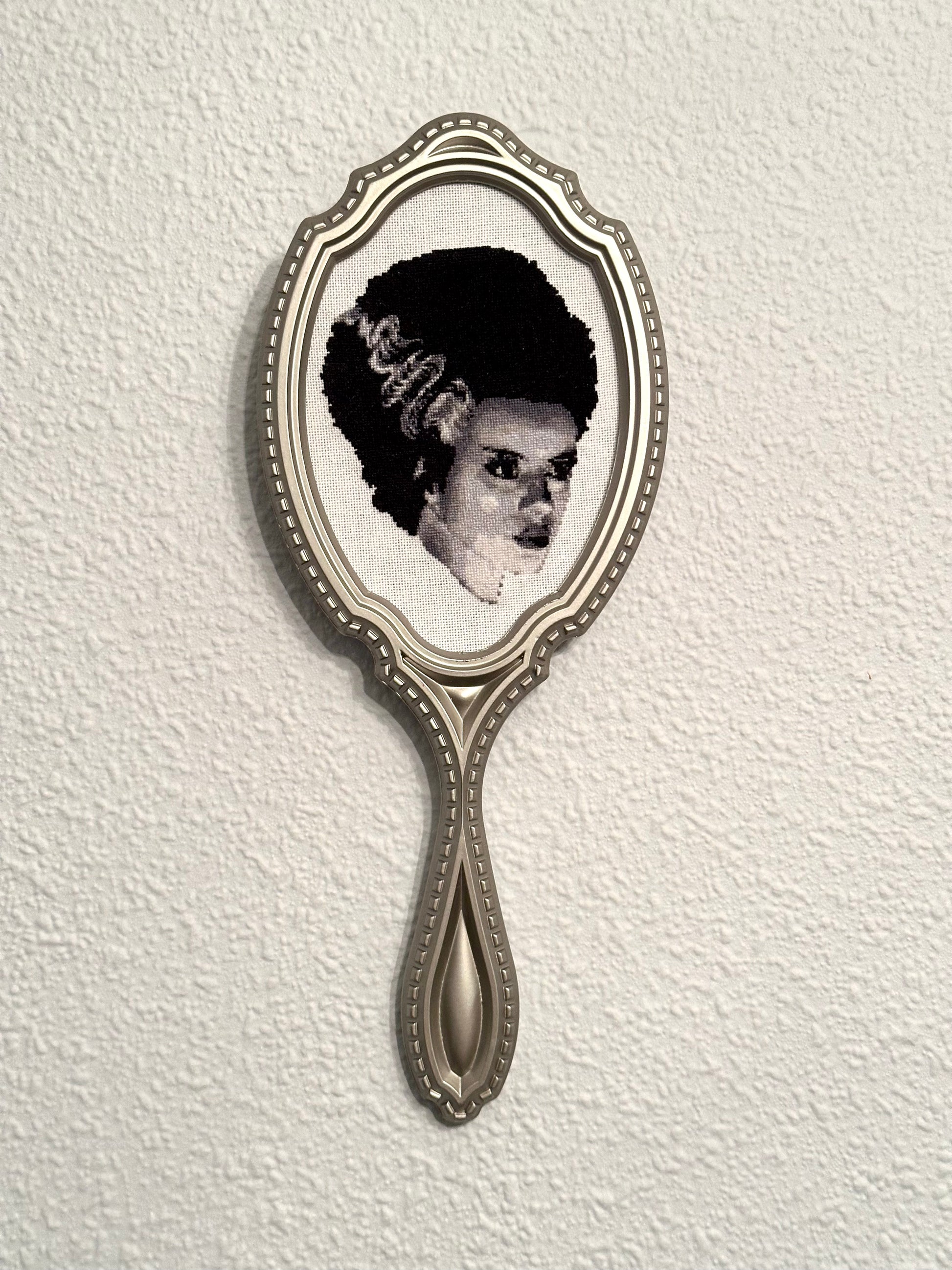 This piece brings the iconic Bride of Frankenstein to life through meticulous hand embroidery. Rather than a traditional frame, the portrait is mounted within an ornate, vintage-style silver hand mirror, creating the beautiful illusion of a ghostly reflection.