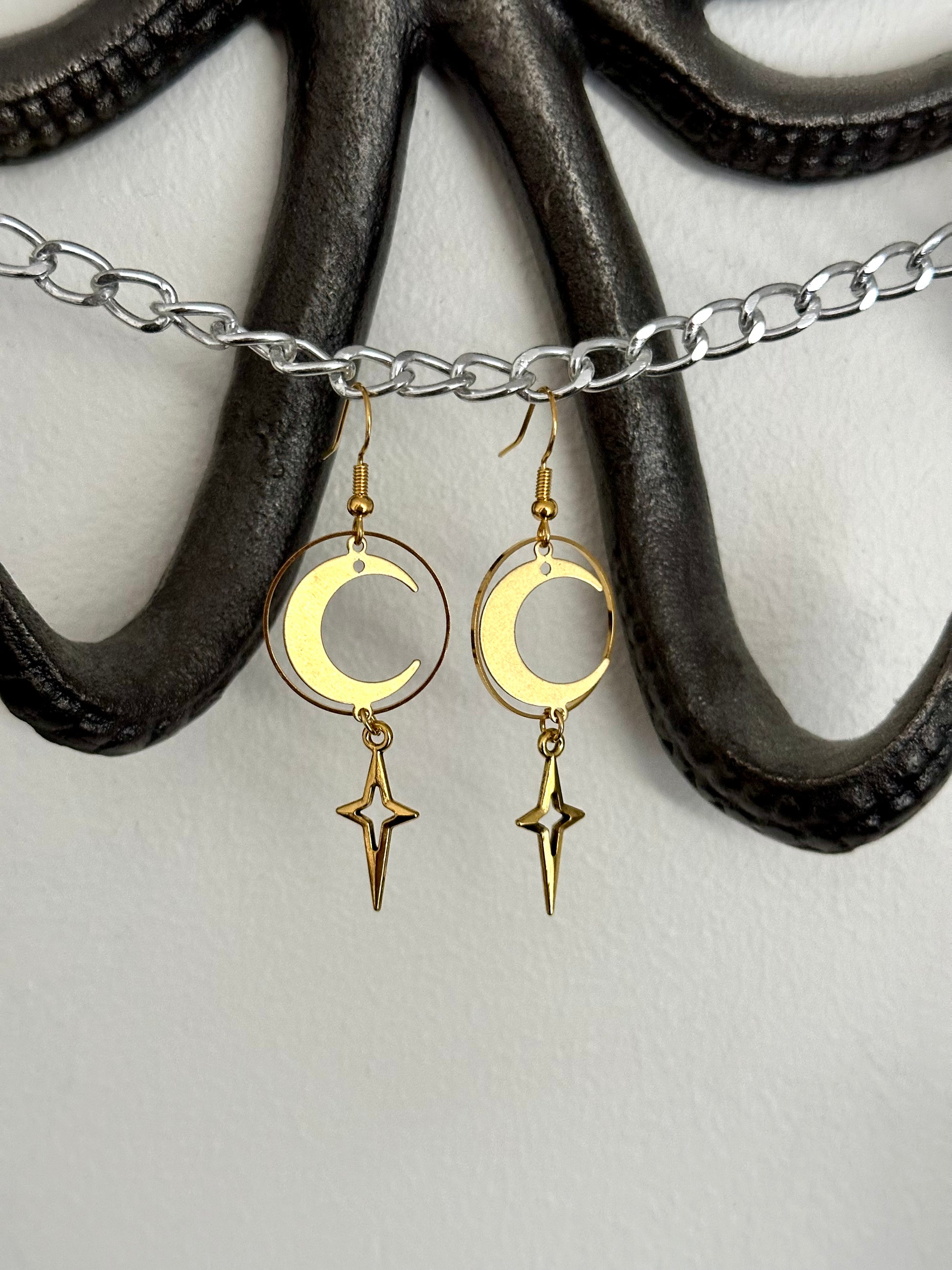 Elevate your accessory game with these celestial inspired earrings! Featuring a delicate crescent moon paired with a shimmering star, these earrings capture the essence of celestial beauty. Crafted with a radiant gold-tone finish, they add a touch of sparkle to any outfit, making them perfect for both everyday wear and special occasions!